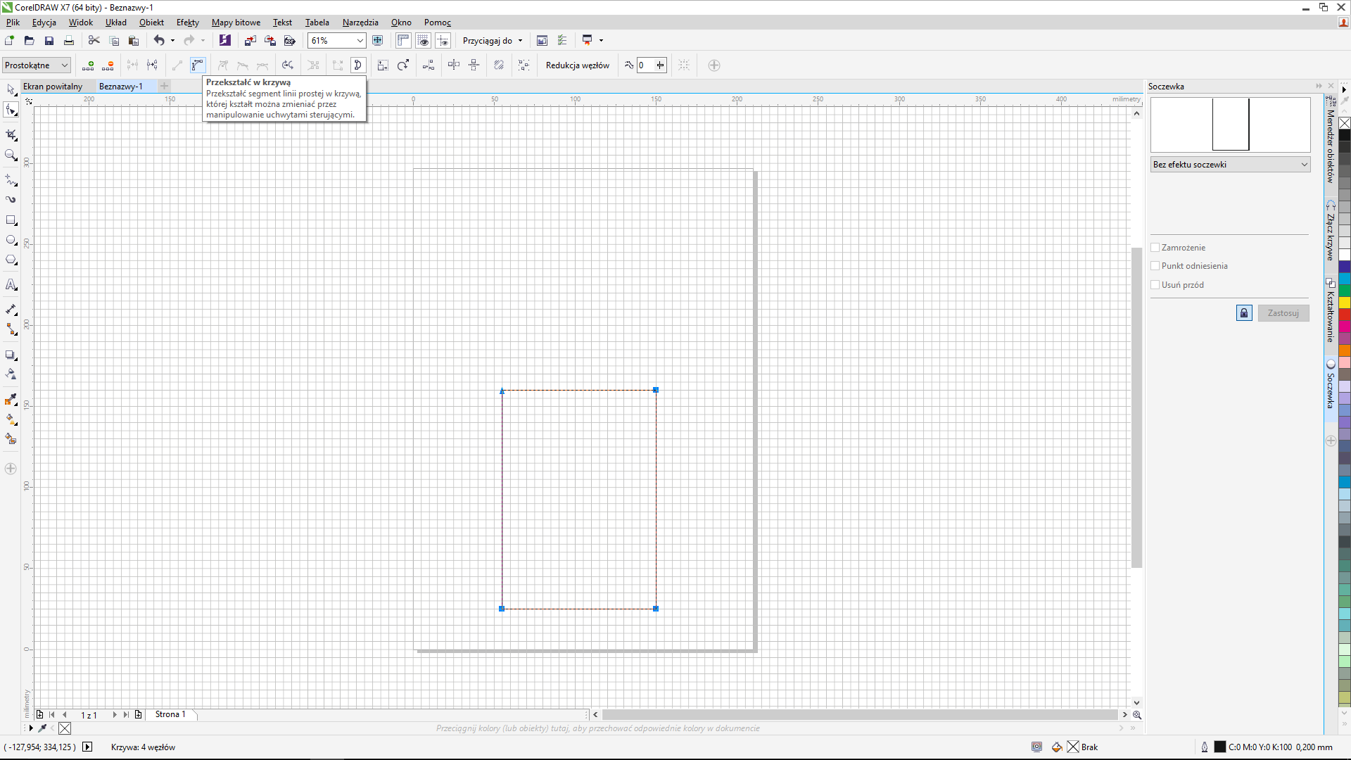Prostokąt ten przekształcamy w krzywe Obiekt/Przekształć w krzywe (ctrl+Q). Następnie narzędziem Kształt (F10) zaznaczamy (wciśnięty shift) wszystkie wierzchołki i przekształcamy je w krzywe.