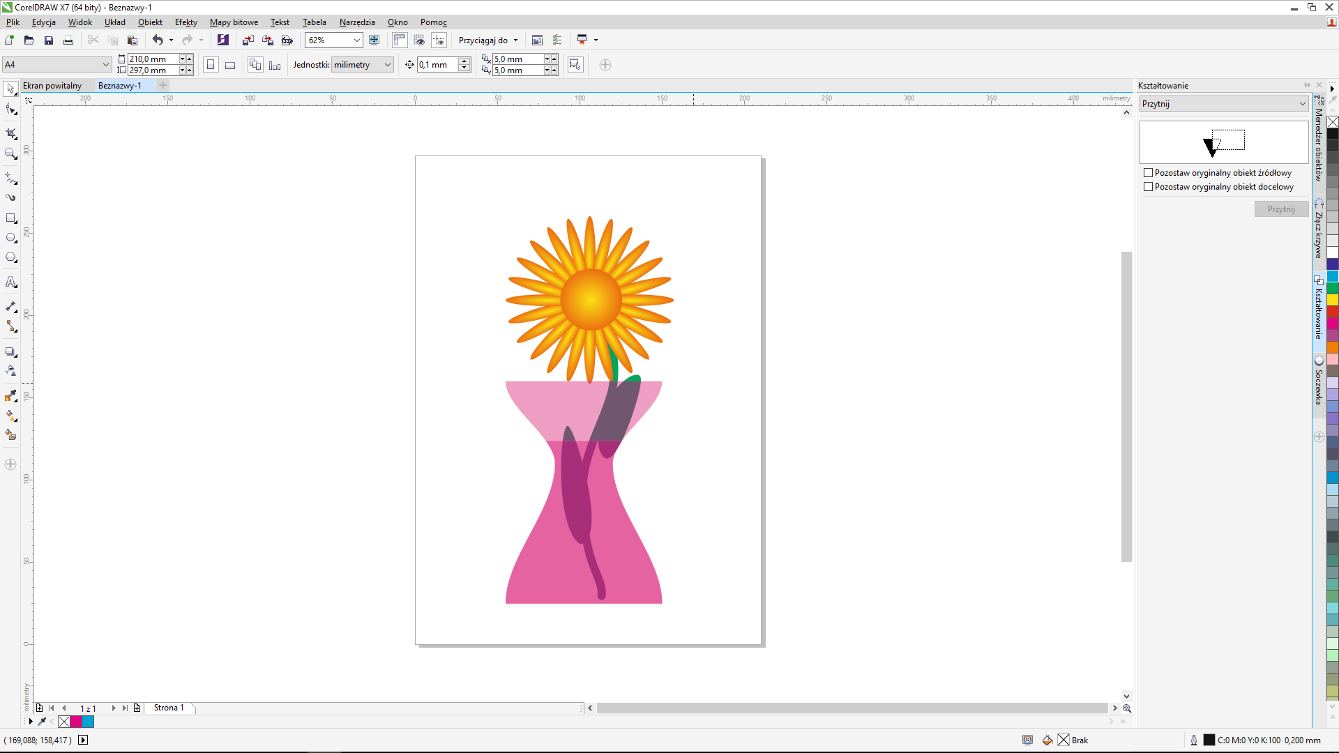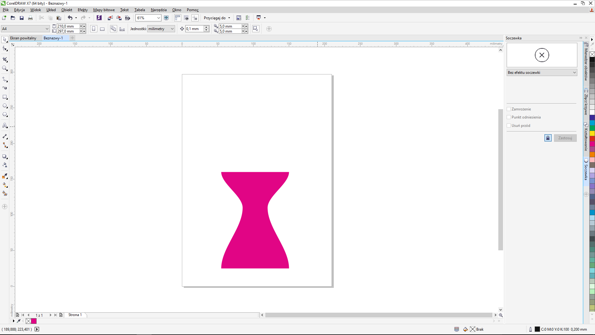Wyłączamy linie siatki Widok/Siatka/Siatka dokumentu. oraz przyciąganie do siatki Widok/Przyciągaj do/Siatka dokumentu (ctrl+Y). Likwidujemy obrys naszego wazonu i wypełniamy go dowolnym kolorem.